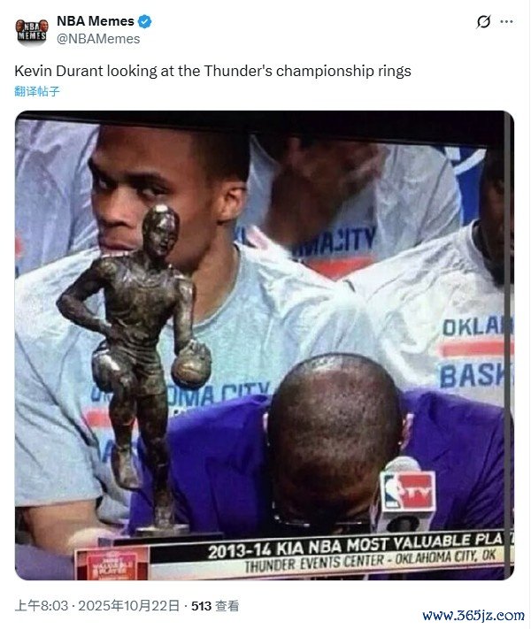 威少看最有价值球员奖杯.JPG!美媒晒经典图:当KD看到雷霆领第一名 戒指时~