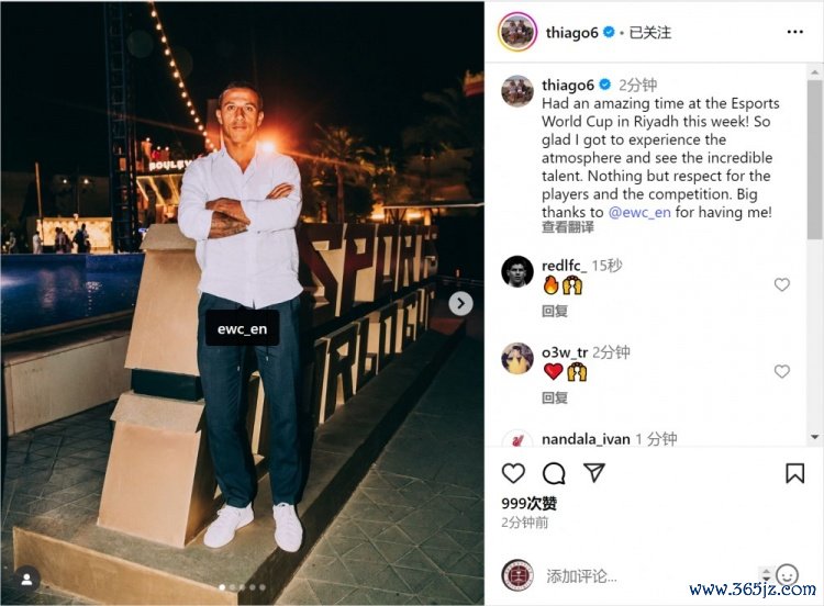 蒂亚戈社媒:很高兴感受 电竞世界杯赛 现场氛围,欣赏天才体育选手 的表演