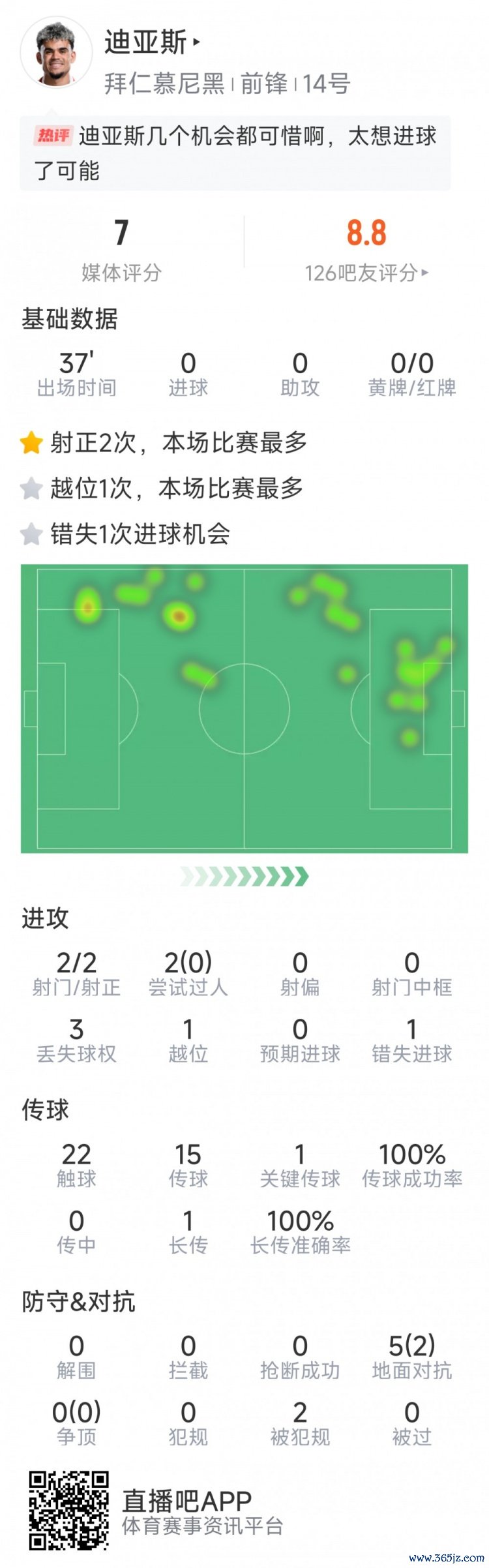 迪亚斯拜仁首秀数据:1次造点,2次射球 均射正,1次错失良机