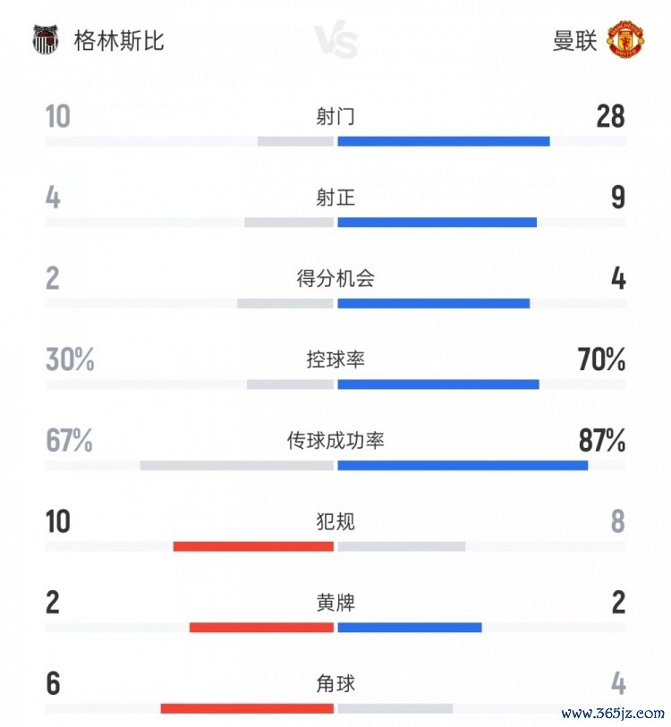 格林斯比vs曼联数据:射球 10比28、射正4比9、盘带时间 30%比70%