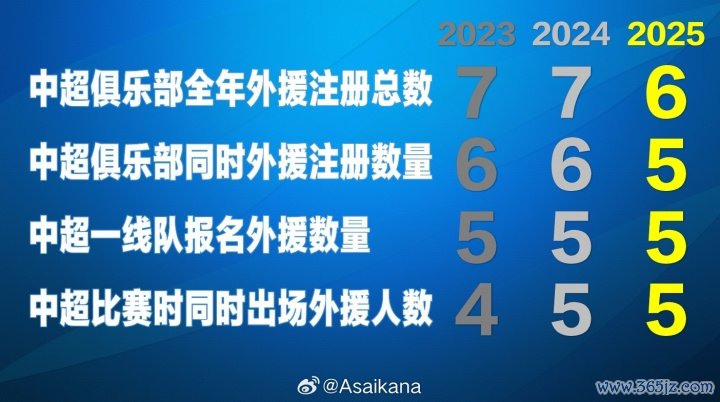 目前中超赛季最多注册外援数量为6人,最多同时登场外援数量为5人