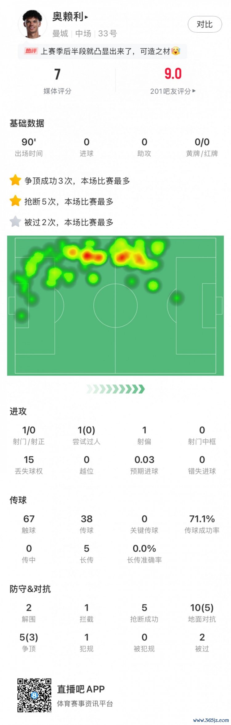 奥赖利数据:抢断5次、成功争顶3次均为全场最多,评分7