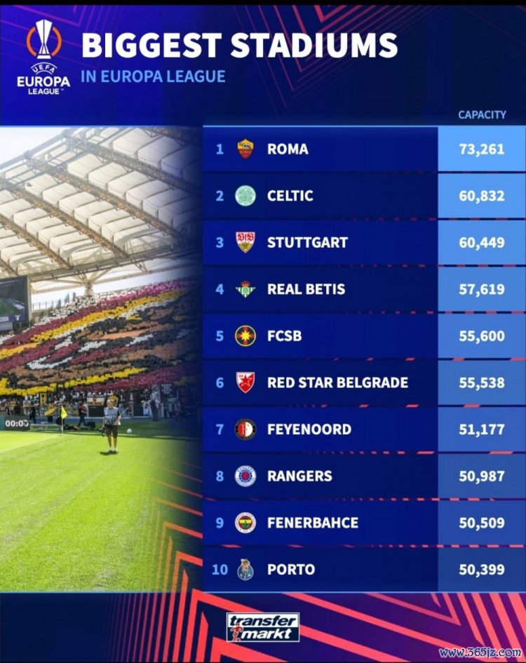 本赛季欧联杯球队主场最大容量榜单:罗马居首,凯尔特人次席
