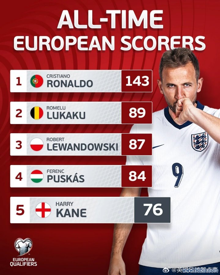 📊 欧洲国家队历史射手榜:凯恩76球进前5名,卢卡库莱万排二三
