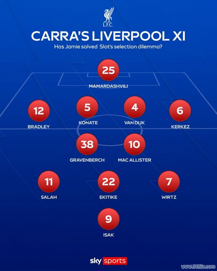 卡拉格排利物浦目前最合适首发:4-2-3-1阵型,伊萨克单中锋
