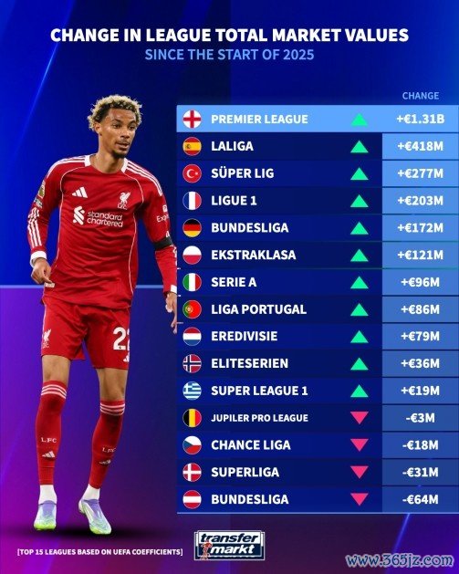 欧洲联赛今年身价变动:英超+13.1亿欧最多,西甲+4.18亿欧次席